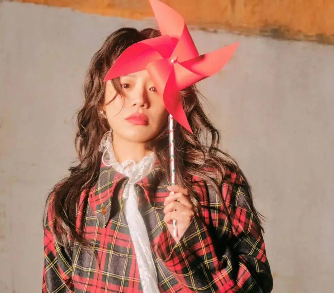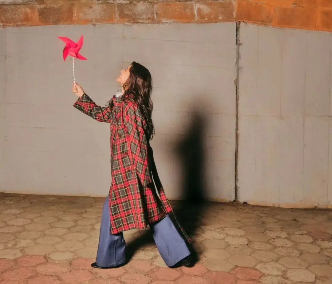 红风车道具和风衣红色格纹完美呼应,让色彩更有呼应感,为复古基调增添灵动少女气。这套look适用于日常出街、城市漫步或拍复古写真。