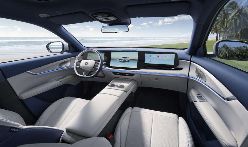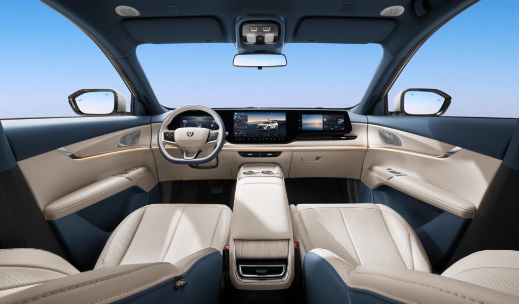 新车采用长安汽车最新“纵横万象”设计美学,前脸搭载同级最宽 V 形格栅,气场沉稳大气;全 LED 都市前大灯内部集成 42 颗高亮 LED 灯珠,尽显锐意锋芒;车尾通过破风尾翼和宽基座设计,构建起磐石般稳固的视觉支撑;车身提供安第斯灰、原子灰、尊贵黑、炫晶白、碧空蓝、星云辉、月华银灰 7 种配色。内饰方面,甄选 NAPPA 细皮纹理皮革,搭配浅色木纹膜片,触感细腻温润;256 色环抱式拾光氛围灯全长 3566mm,烘托出行氛围感。此外,内饰提供幕夜黑、热浪橙、慕雪青山三款主题色可选。