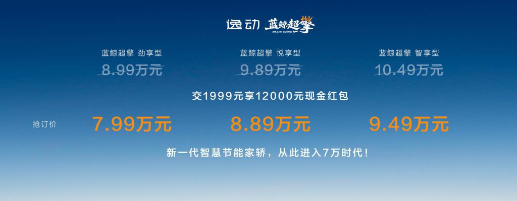 第四代逸动蓝鲸超擎发布抢订价:交 1999 元享 12000 元现金红包,蓝鲸超擎劲享型抢订价 7.99 万元、蓝鲸超擎悦享型抢订价 8.89 万元、蓝鲸超擎智享型抢订价 9.49 万元。购全系车型用户可享五大限时购车权益:置换礼:置换至高 7000 元(本品 4000 元,非本品 2000 元,长安逸动系列老客户限时叠加 3000 元补贴);金融礼:4 万 24 期 0 息、0 首付、5 年低息超长贷;保养礼:限时赠送 3 年或 6 次基础保养;质保礼:首任非营运车主 HEV 混动系统核心部件终身质保;流量礼:基础流量免费,娱乐流量 3 年免费(6G/ 月)。